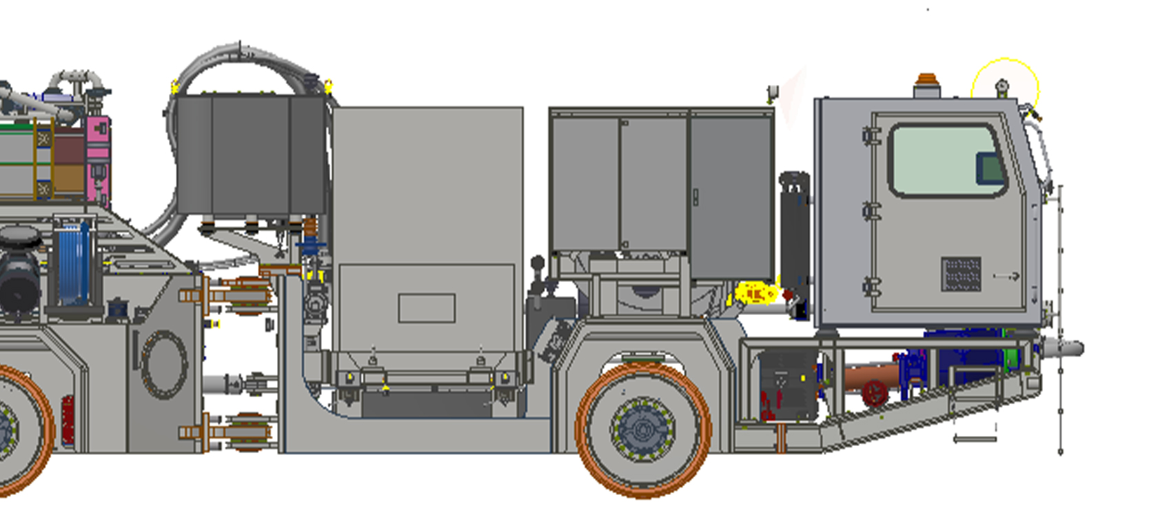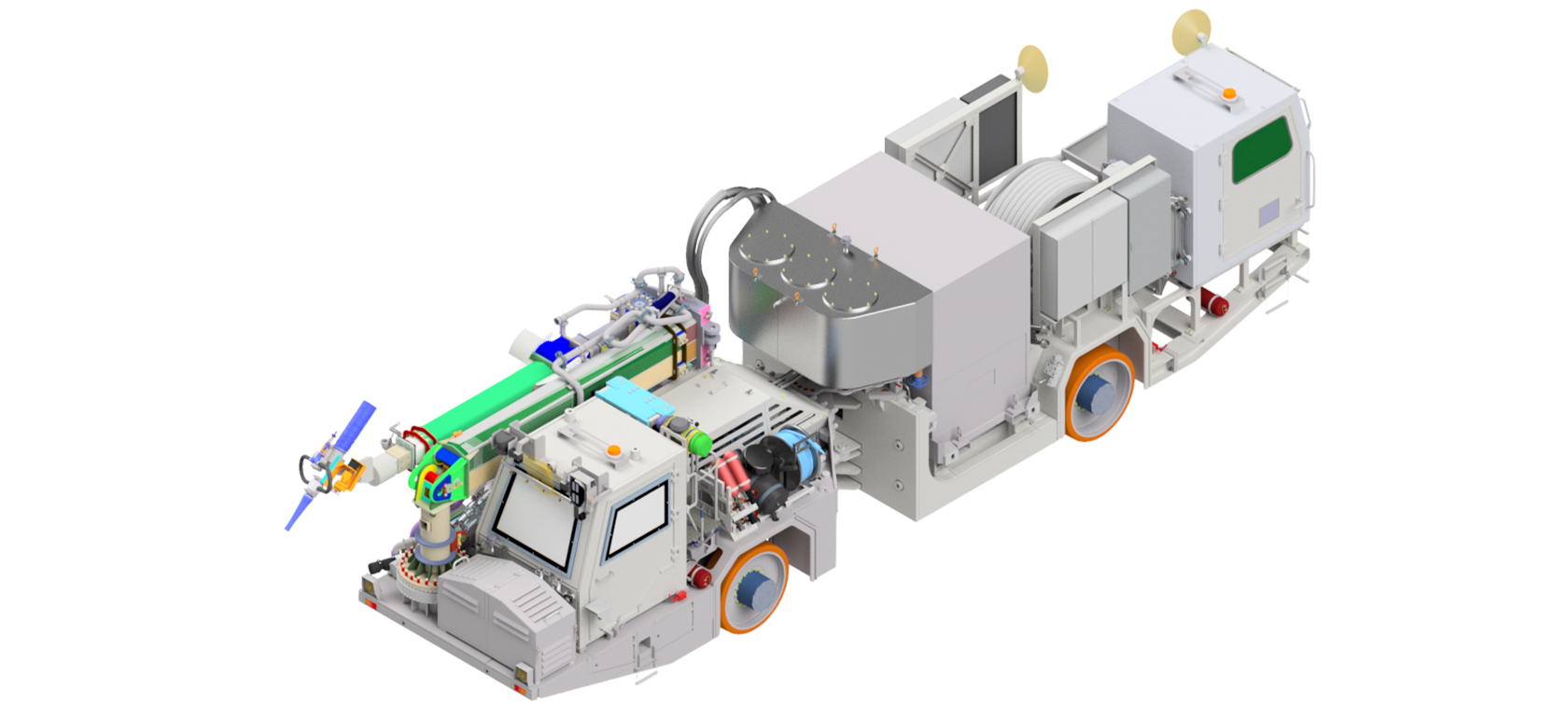 The vehicle is articulated and has an unladen weight of 48.8 tonnes. It consists of a front and a rear vehicle, each with a cabin that is specially shielded against ionising radiation. The front cabin can be raised by 1,695 millimetres using a lifting unit, while the rear cabin is rigid. The required building material is transported from the rear to the front of the spray manipulator arm via a concrete pump, and the spraying process itself is carried out electrically. Cameras are mounted on the vehicle for good all-round visibility.