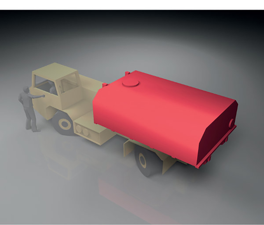 The TAURUS IV is a versatile roll-off tipper vehicle that has been specially developed for underground logistics tasks. As shown, the vehicle can be used, for example, as a mobile diesel tanker with a capacity of 8,000 litres to reliably refuel underground vehicles. Alternatively, the tank cassette can also be parked at a central petrol station and operated as a stationary refuelling station.